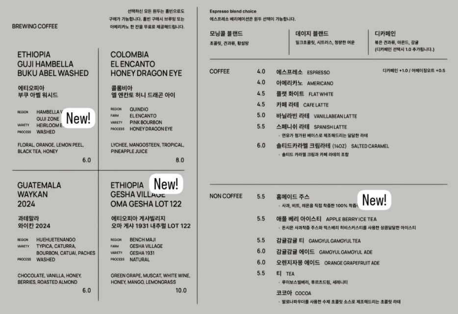 나는 주로 드립을 마시는데 로스팅을 직접 하시기 때문에 라인업이 자주 바뀐다.