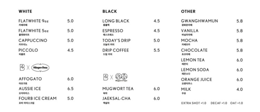 우리는 드립커피, 광화문 라떼, 쑥 차를 주문했다.