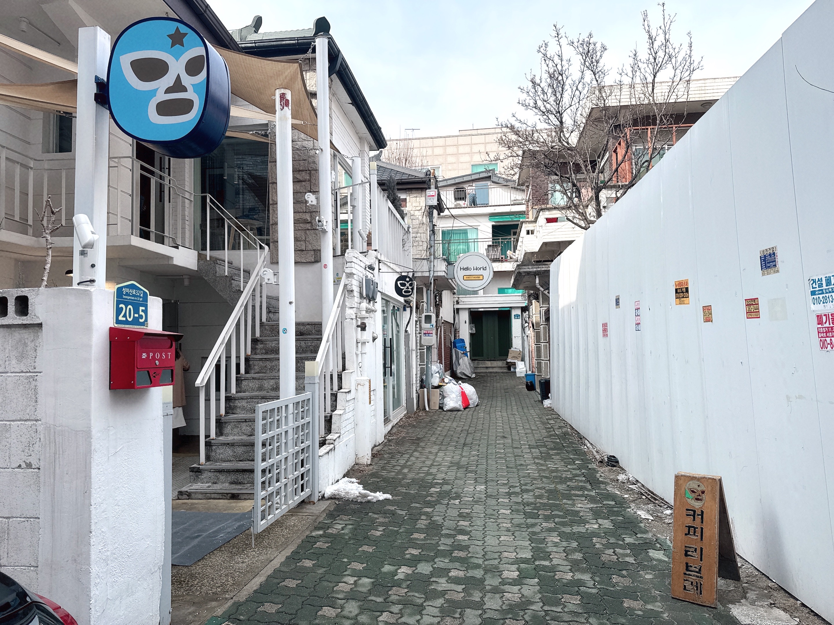 골목에서부터 눈길을 사로잡는 가면 마스코트(?)