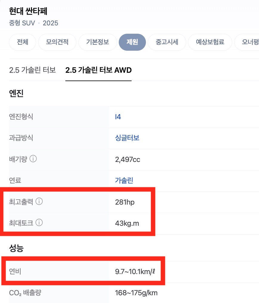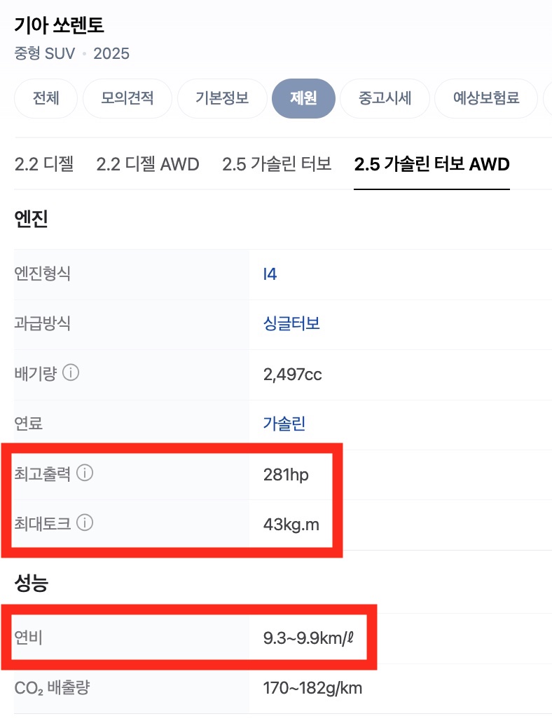2.5 가솔린 터보 AWD로 비교해 봤다.