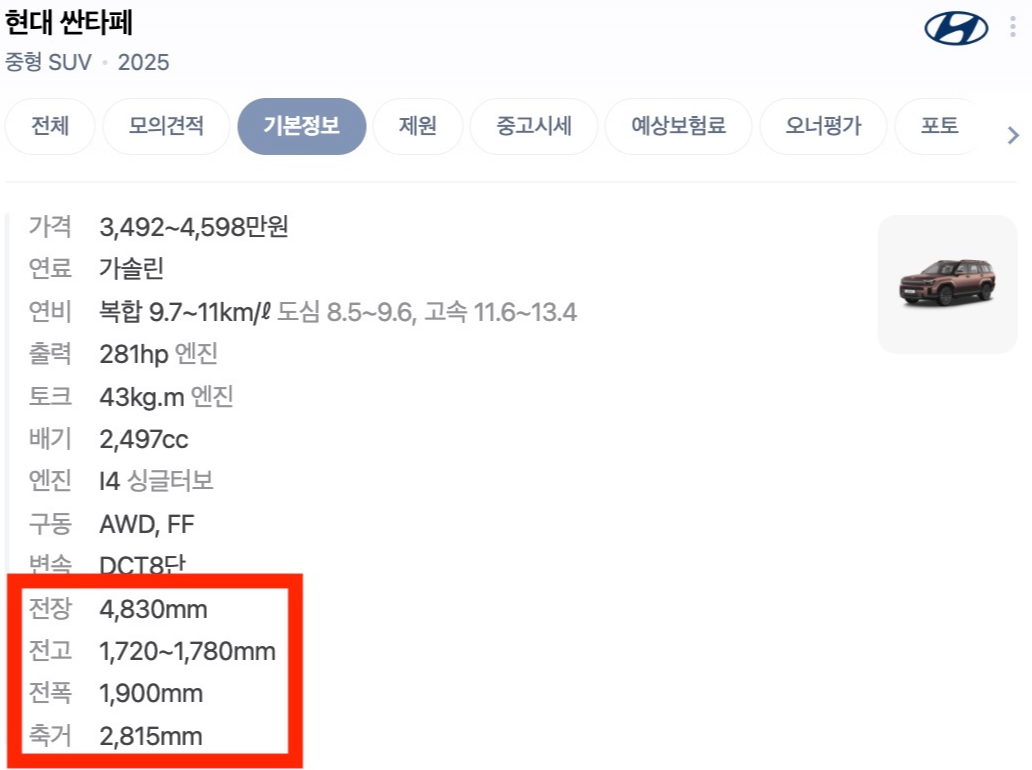 별 차이는 없지만 그래도 싼타페가 좀 더 큰 듯하다.