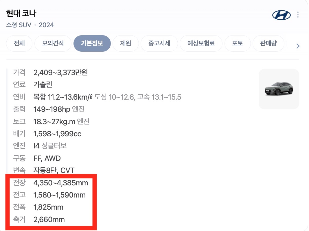 전폭 - 양 옆 사이드 미러를 제외한 자동차 가로길이
