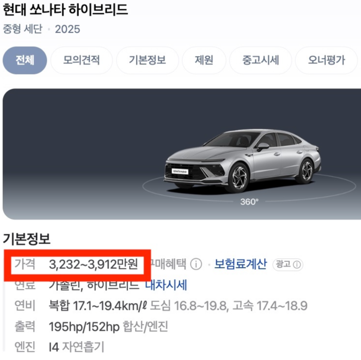 최대 가격은 쏘나타가 조금 더 비싸다.
