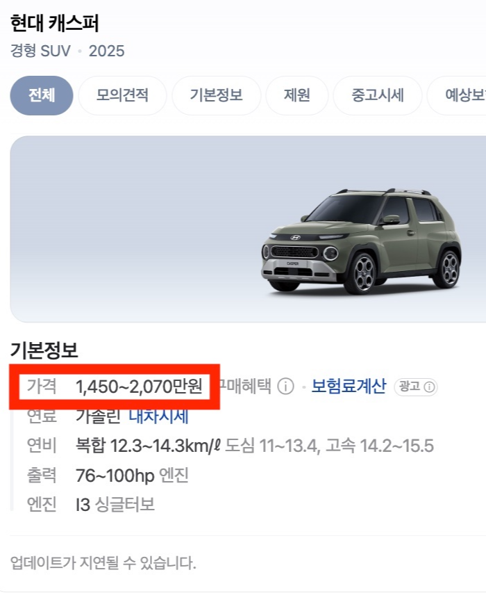 가격은 캐스퍼가 더 비싸다.