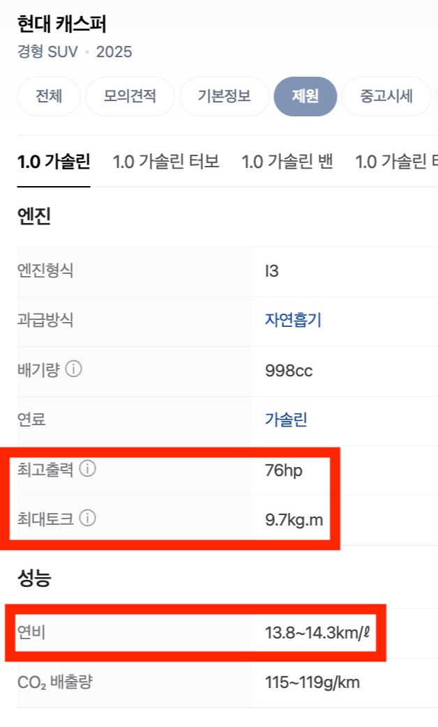 연비를 보니 캐스퍼가 좀 더 잘 나온다.